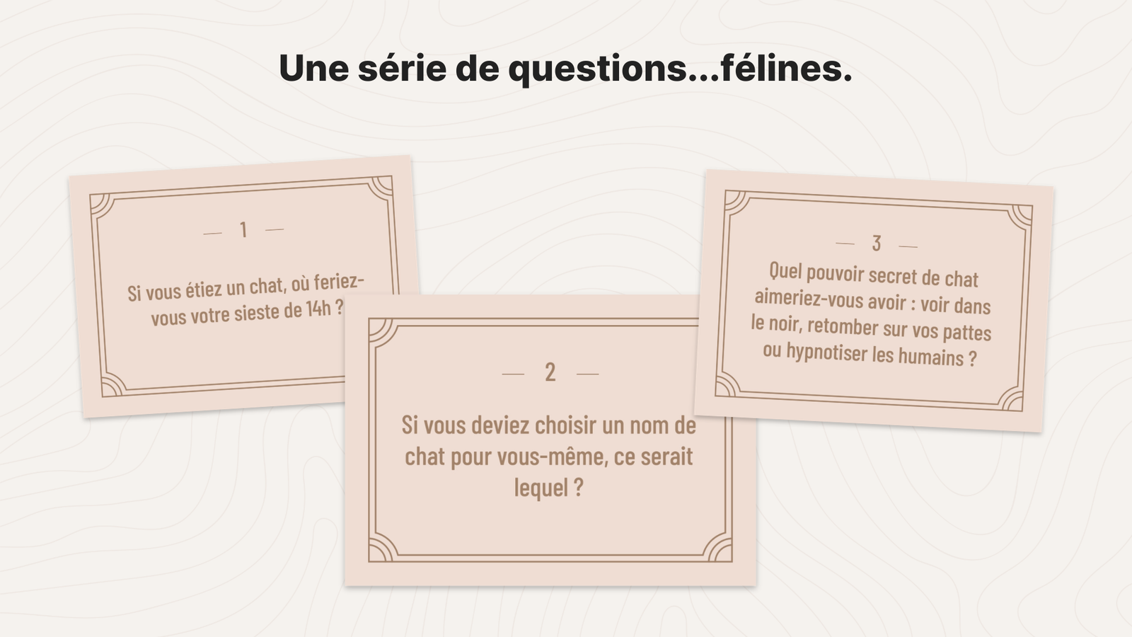 - Connaissance de soi féline (ex. : « Si vous étiez un chat célèbre, lequel seriez-vous ? »)