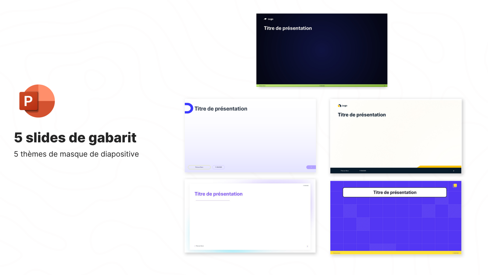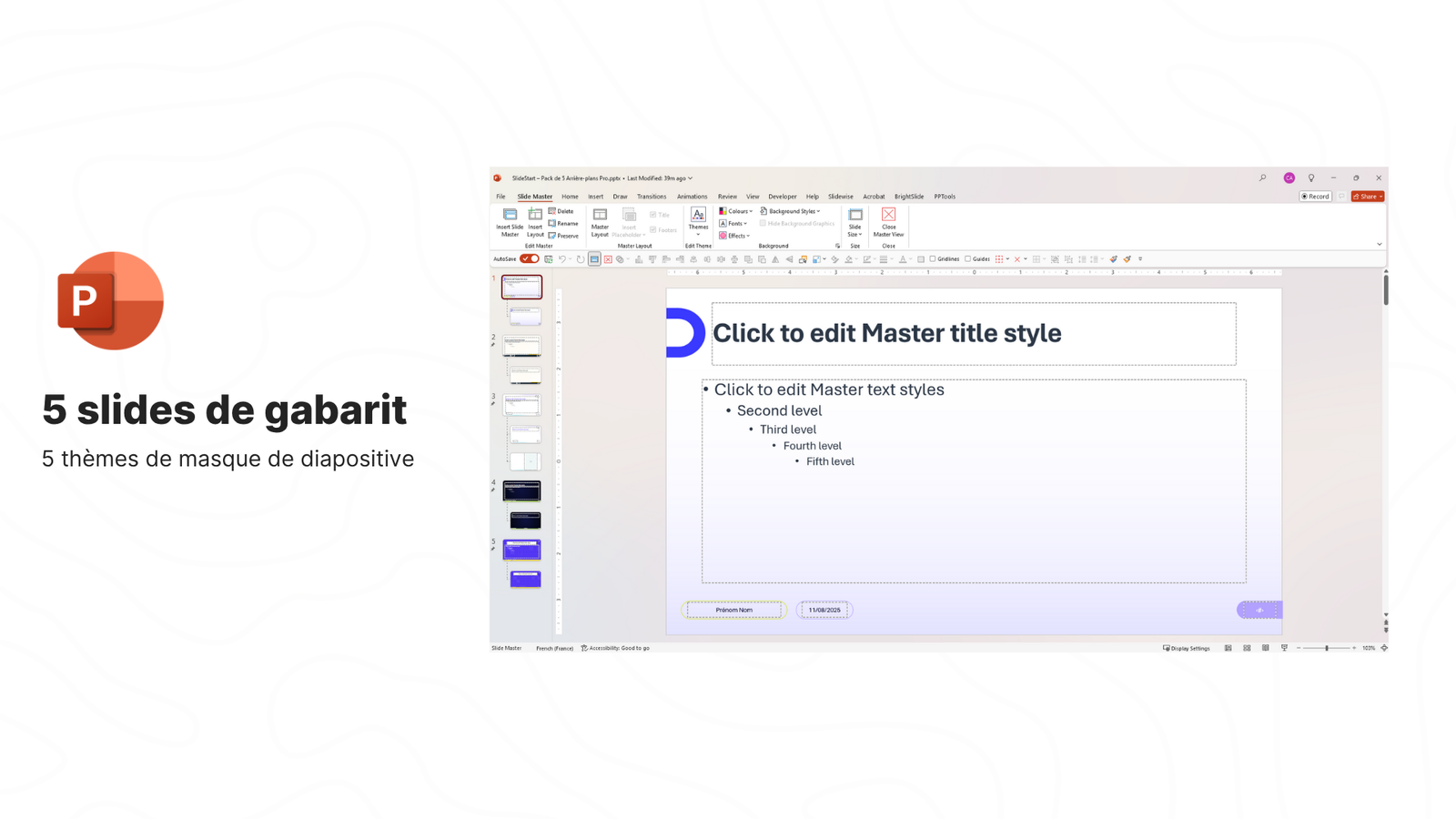 Avec SlideStart, vous accédez à 5 gabarits d’arrière-plan professionnels, prêts à personnaliser sur PowerPoint.
